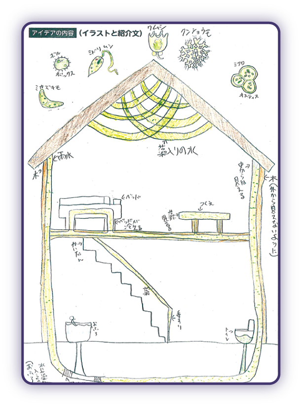 外からは藻が見えず、目立たないし、中の人だけ楽しめて特別感がある。雨水を使っている。おふろには藻が入らないようにしている。水が通っているため、ベッドや家がすずしくなる。つくえや手すりにも水が通っていて、かんさつできる。