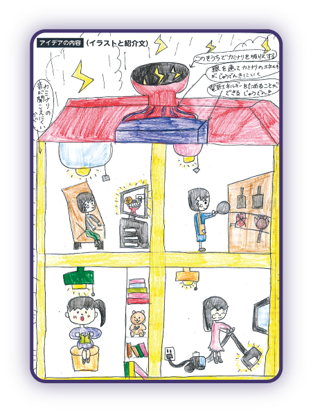 屋根の上に、雷の電気エネルギーを吸収するそうちがあって、雷をたくさん吸収します。この吸収された雷は、じゅうでんきにためておくことができます。日常生活の中で、電気として使えるし、停電した時にも使えます。外はまっくらでも、家の中は明るくなり、雨の日でもこわくありません。また、この家のカベは、雷の音を聞こえにくくしてくれます。安心して生活できる家です。